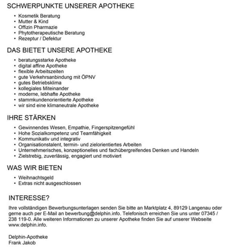 Ihre vollständigen Bewerbungsunterlagen senden Sie bitte an Marktplatz 4, 89129 Langenau oder gerne auch per E-Mail an bewerbung@delphin.info. Telefonisch erreichen Sie uns unter 07345 / 238 119-0. Alle weiteren Informationen zu unserer Apotheke finden Sie auf unserer Webseite www.delphin.info.