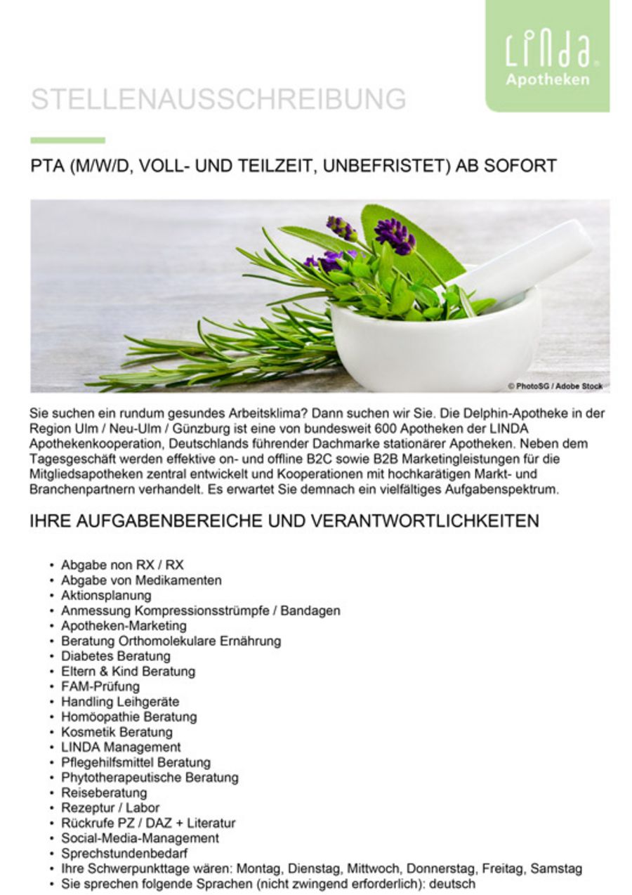 Sie suchen ein rundum gesundes Arbeitsklima? Dann suchen wir Sie. Die Delphin-Apotheke in der Region Ostalb / Donautal / Schwaben ist eine von bundesweit 600 Apotheken der LINDA Apothekenkooperation, Deutschlands führender Dachmarke stationärer Apotheken. Neben dem Tagesgeschäft werden effektive on- und offline B2C sowie B2B Marketingleistungen für die Mitgliedsapotheken zentral entwickelt und Kooperationen mit hochkarätigen Markt- und Branchenpartnern verhandelt. Es erwartet Sie demnach ein vielfältiges Aufgabenspektrum.